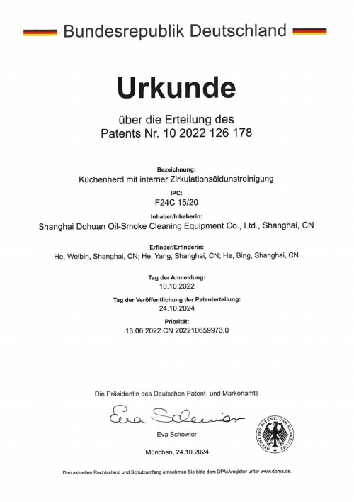 熱量祝賀上海多環(huán)公司內循環(huán)式油煙凈化灶體技術獲得德國發(fā)明專利