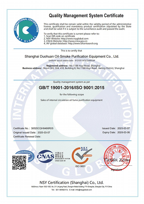 ISO9001認(rèn)證 是全球公認(rèn)的質(zhì)量管理標(biāo)準(zhǔn),它代表著國際社會對上海多環(huán)油煙凈化設(shè)備有限公司產(chǎn)品質(zhì)量的認(rèn)可,也標(biāo)志著多環(huán)公司在規(guī)范化、標(biāo)準(zhǔn)化、國際化的道路上邁出了堅實的一步。