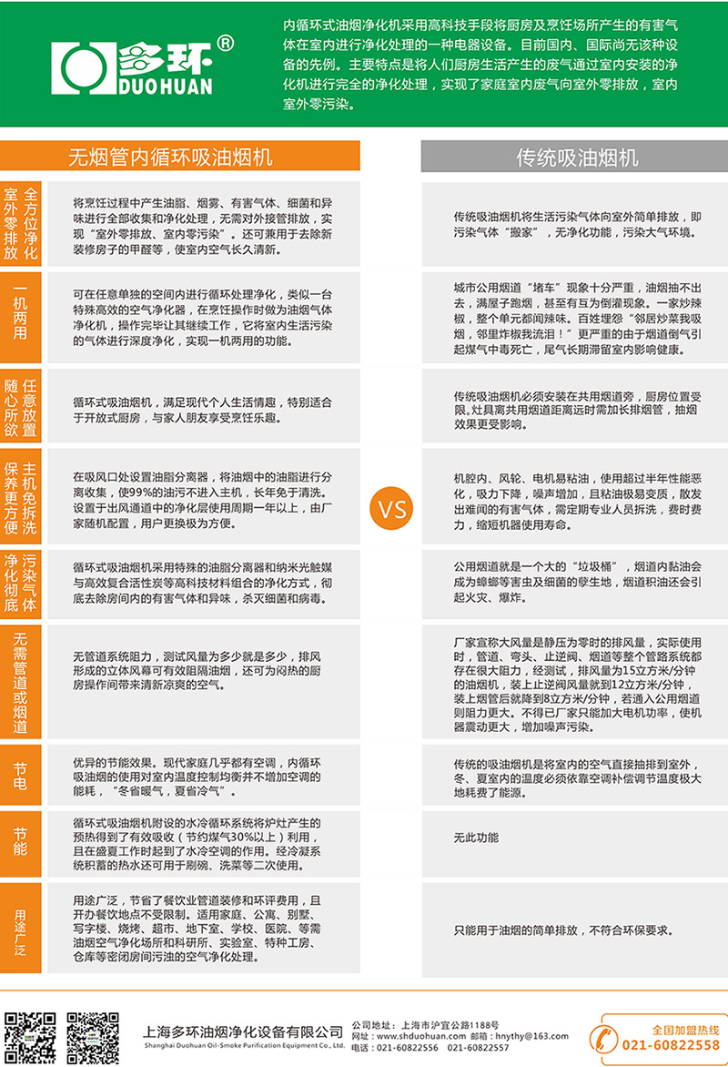 多環(huán)公司小型無(wú)煙管內(nèi)循環(huán)油煙機(jī)與傳統(tǒng)吸油煙機(jī)的比較